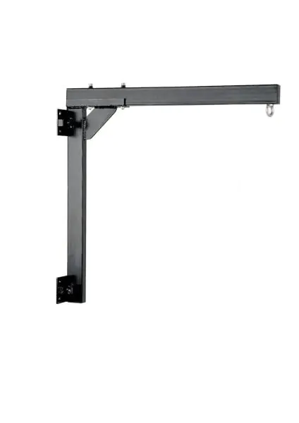 Die schwenkbare Konstruktion ermöglicht es, den Boxsack oder Sandsack nach rechts zu bewegen, um Platz zu schaffen oder den Trainingsbereich flexibel zu gestalten. Die Befestigung des Boxsacks oder Sandsacks erfolgt über eine Ösenschraube, die mit einem Karabinerhaken verbunden ist, für eine schnelle und einfache Montage.