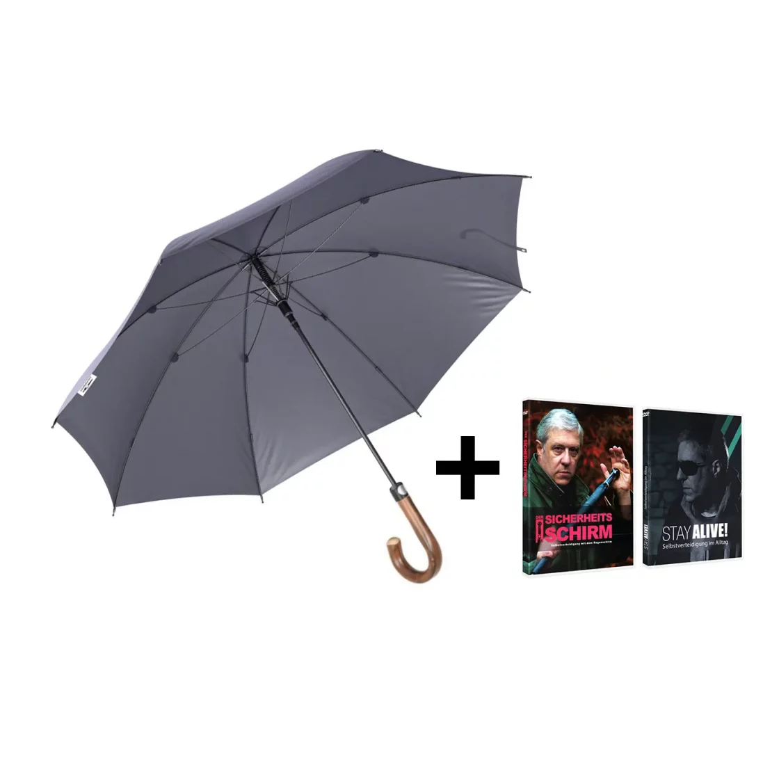 Was für dich aussieht wie ein unscheinbarer Alltagsgegenstand, ist für einen potenziellen Angreifer ein Grund, dich nicht als Opfer anzusehen. Allein das Tragen des Schirms an deinem Körper kann schon ausreichen, damit du verschont bleibst. Du wirkst selbstsicherer und durch eine abwehrende Geste mit dem Schirm in der Hand bedrohlicher auf deinen Angreifer.
